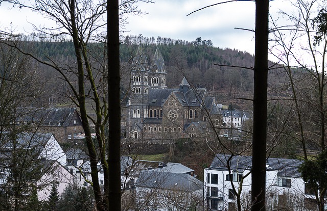 As the trail reaches Clervaux, the town slowly reveals itself between the hills. The towers of the Church of Saints Cosmas and Damian rise first — a neo-Romanesque landmark from 1910–1911 that seems to welcome hikers into the valley.