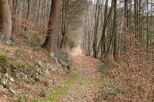 As soon as the trail leaves Troisvierges, it dives into peaceful woodland. Here, CFL Trail 1 follows former trade and farm paths, now lined with moss, fallen leaves, and forest fungi — gentle reminders of how people once travelled between the villages of the Ardennes.