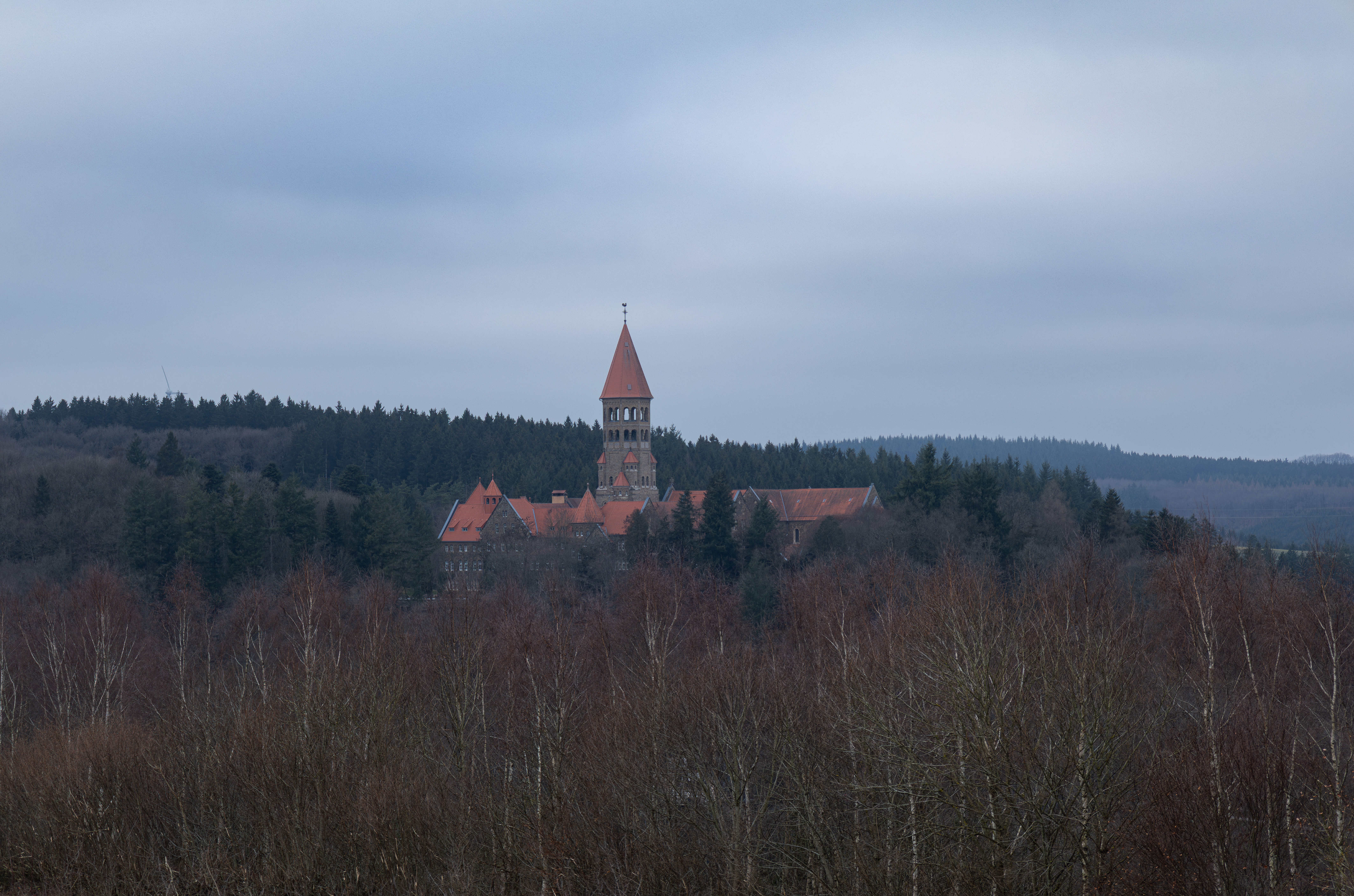 As the trail reaches Clervaux, the town slowly reveals itself between the hills. The towers of the Church of Saints Cosmas and Damian rise first — a neo-Romanesque landmark from 1910–1911 that seems to welcome hikers into the valley.